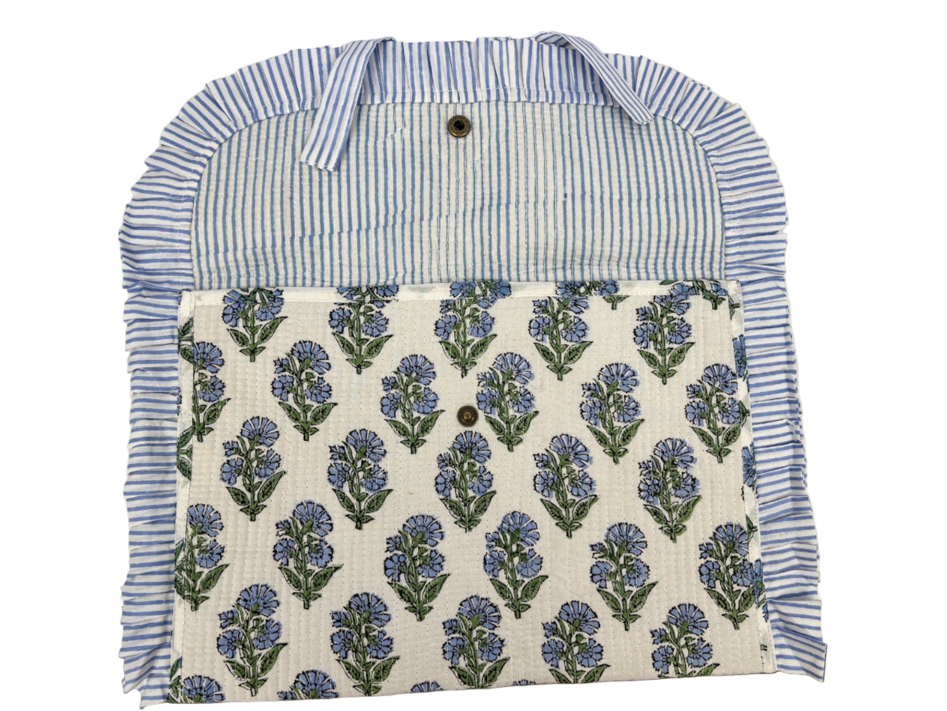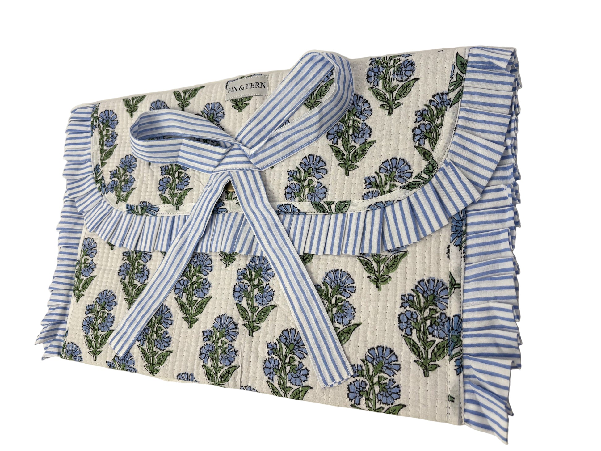 This Ruffle Bayberry laptop sleeve is lightweight and lovely. This slim fabric sleeve pairs our blue floral print with a crisp striped ruffle and bow.