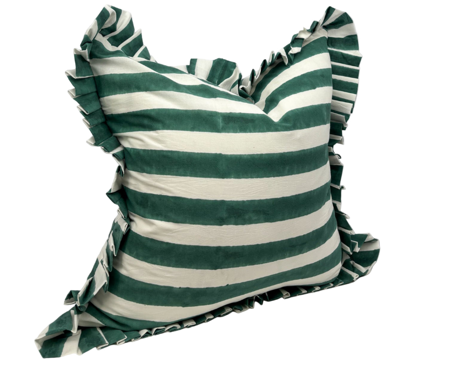 Bring a breezy, laid-back look to your space with our Greenpoint Strip Ruffle pillow cover. The wide green and cream stripes with the ruffled edges brings a relaxed vibe to any space.